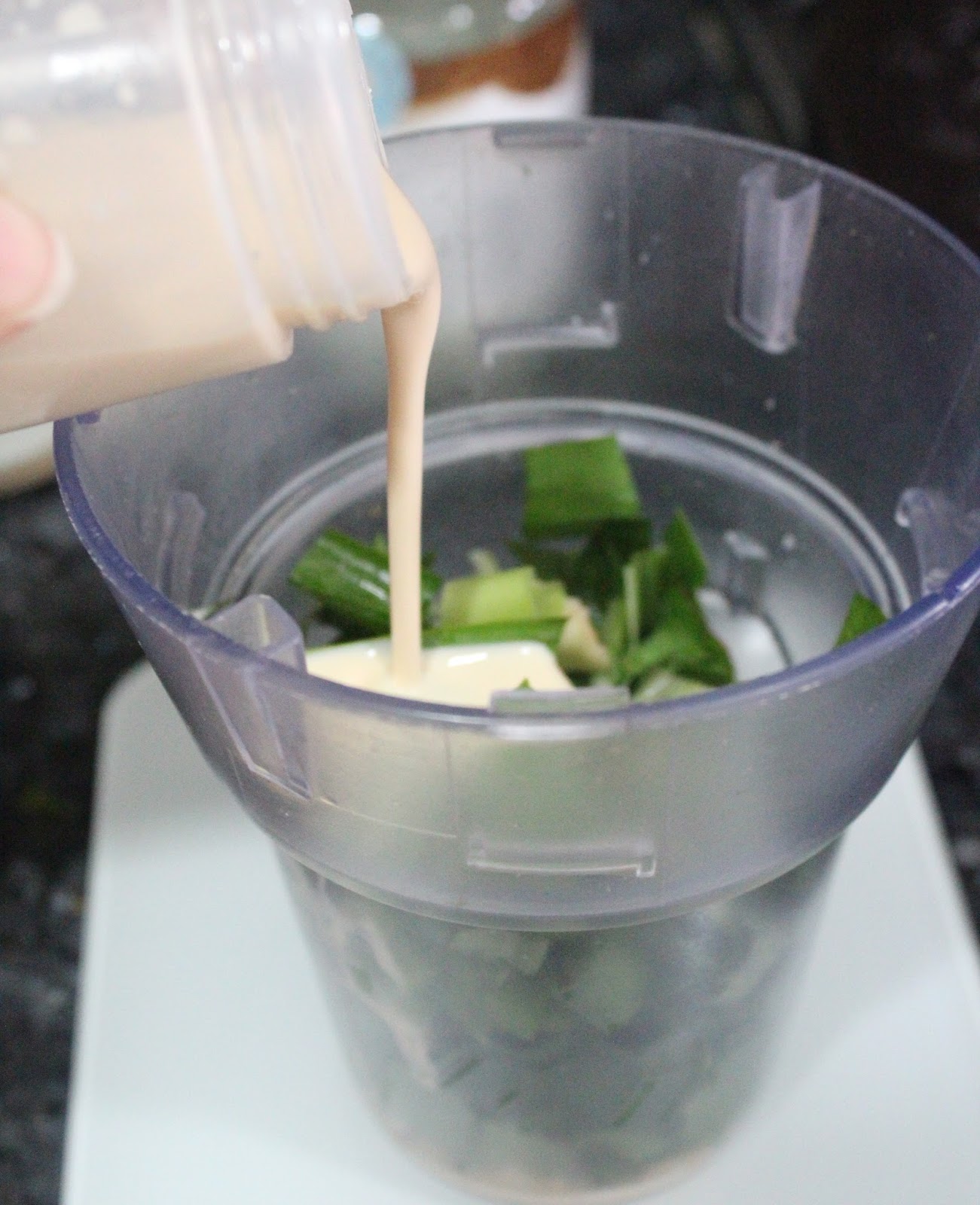 - Snip the pandan leaves into smaller pieces and add evaporated milk together into the blender container.